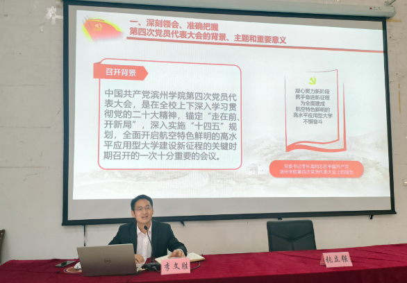会上,李文胜以“全面学习,全面把握,全面落实学校第四次党员代表大会精神,为全面建成航空特色鲜明的高水平应用型大学不懈奋斗”为题,从深刻理解、准确把握大会召开的主题和重要意义、第三次党代会以来的工作成绩、第四次党员代表大会总结的发展经验、新阶段新征程的奋斗目标和战略安排、今后五年的发展目标和任务等七个方面,对党委书记李长海同志在学校第四次党员代表大会上所做的党委报告,进行了深刻的解读和阐释。一组组清晰直观、跨越发展的数据对比,一个个鼓舞人、催人奋进的发展成就,增强了同学们对学校的归属感、荣誉感、自豪感,在心灵深处植下了厚重的爱校荣校情怀,在脑海里深深的刻下了“自强不息、守正出奇”的学校精神。最后他勉励团学干部要充分发挥模范带头和示范带动作用,在学习宣传贯彻学校党员代表大会精神上当先锋、做表率,团结带领广大团员青年同频共振、同向发力,绘就学校共青团事业最大“同心圆”,为奋力谱写航空特色鲜明的高水平应用型大学更加出彩绚丽篇章贡献青春力量、展现青年担当。