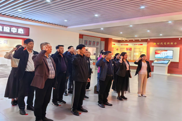 在讲解员引领下,大家依次参观了“新使命—全面从严治党永远在路上”、“新常态—持之以恒正风肃纪”、“新休养—淬炼本色永葆初心”等几大板块内容的十几个展区。每个展厅紧扣廉政主题,将廉政文化融入到党风廉政宣传教育中,通过图片资料、影像视频、全息投影等多种形式,展示了我党自建党以来反腐倡廉的历史脉络和决心,通过近年来违纪违法典型案例,使党员干部受到了深刻教育与警示,从党的反腐历程中看到了我党惩治腐败的成就。大家认真聆听讲解、不时驻足观看,一组组翔实的史料、一幅幅真实的照片、一个个鲜活的案例,使大家深受警醒、深感震撼。在鲜艳的党旗前,全体党员重温入党誓词,表达了“不忘初心、牢记使命”的坚定决心。